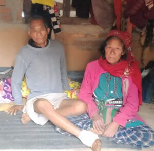Die 61-jährige Kanchi Maya und ihr 63-jähriger Mann Hun Bahadur gehören zu den ärmsten Menschen in der Region, doch bisher kamen sie einigermaßen zurecht. Zwar können ihre sechs erwachsenen Kinder ihnen nicht helfen, da auch sie arm sind, doch Hun Bahadur fand als Tagelöhner immer wieder Arbeit im Hausbau und konnte damit in manchen Monaten zwischen 50 und 60 Euro verdienen. Mit dem unregelmäßigen Verdienst konnte sich das Paar gerade so ernähren. Doch letzten Dezember ist Hun Bahadur beim Holzsammeln von einem Baum gestürzt und hat sich am rechten Knöchel das Bein gebrochen. Nachbarn brachten ihn ins Krankenhaus, wo man er stationär aufgenommen werden sollte, doch das Paar hatte kein Geld dafür und ist nach einer minimalen Behandlung nach Hause zurückgekehrt. Die Wunde hat sich dann entzündet und nach einer weiteren Untersuchung baten die Ärzte Hun Bahadur ca. alle zwei Wochen zum Check-up und Säubern ins Krankenhaus zu kommen. Er muss täglich Medikamente gegen die Entzündung und die Schmerzen nehmen. Aufstehen oder laufen kann er nicht, da auch sein Rücken in Mitleidenschaft gezogen wurde. Wenn Hun Bahadur zum Arzt muss, müssen ein paar starke Männer aus der Nachbarschaft ihn bis zur Straße tragen.