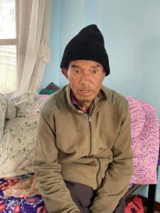 Der 62-jährige Bom Bahadur kommt aus Taplejung im äußerten Osten Nepals. Vor einigen Monaten verstarb seine Frau, Kinder haben die beiden keine. Bom arbeitete früher in einer Teppichfabrik, doch vor ein paar Jahren erlitt plötzlich einen kleinen Schlaganfall und war gelähmt. Nach mehreren Therapien konnte er sich langsam wieder bewegen und ist heute in der Lage mit einem Stock zu gehen. Da Bom keine Angehörigen hat, die sich um ihn kümmern könnten, lebt er seit Ende 2022 im Pflegeheim.