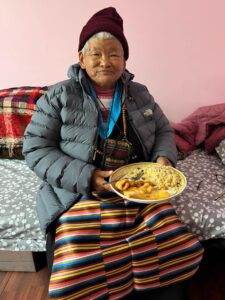 Die 73-jährige Norkyima wurde in einem entlegenen Dorf des Distrikts Taplejung geboren. Es ist der nordöstlichste Distrikt Nepals, der an Tibet und das indische Sikkim angrenzt. Norkyimas Vater verstarb als sie noch ein kleines Kind war und so heiratete die Mutter ein zweites Mal, zog weg und so wurde Norkyima von ihrem älteren Bruder großgezogen, der aber jung verstarb. Daraufhin kümmerten Nachbarn sich um das Kind. Sie holten Norkyima nach Kathmandu, wo sie der Familie im Haushalt half. Als die Familie dann in die USA auswanderte, fand sie Arbeit in einem Restaurant an der Grenze zu Bhutan. Da Norkyima mit zunehmendem Alter nicht mehr so hart arbeiten konnte, entließ man sie vor einiger Zeit und so suchten Bekannte einen Platz für Norkyima, an dem sie ihren Lebensabend verbringen kann. Seit Dezember 2024 lebt Norkyima im Pflegeheim, wo sie gerne den anderen Bewohnern hilft. Zwar ist Norkyima gehörlos, doch sie ist eine fröhliche Bewohnerin mit großem Herzen und sie liebt es in der Küche auszuhelfen.