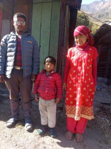 Der 40-jährige Phur Pasang lebt mit seiner 29-jährigen Frau Sonam und deren Tochter Dolkar in Pelko, Raum Briddhim. In seiner Jugend lebte er als Mönch im Kloster Dzongkar Choede in Süd-Indien, wo sein Bruder Thokme noch immer lebt. Die Geschwister sind Neffen unseres Mitarbeiters Nyima und viele der Familienangehörigen waren bzw. sind in unserem Patenschafts-Programm. Phur Pasangs Mutter ist Lhakpa Yangchen. Sie hat seit vielen Jahren eine Patenschaft. Für Lhakpa und ihren verstorbenen Mann hatten wir zudem das während des Erdbebens 2015 zerstörte Wohnhaus wieder aufgebaut. Zwei von Phur Pasangs Geschwister hatten wir ebenfalls mit Patenschaften unterstützt. Die 50-jährige Rabhi, die wir seit Jahren mit Extraspenden und vor Kurzem mit einer Aktion für neue Zähne unterstützt hatten, ist Sonams Mutter.